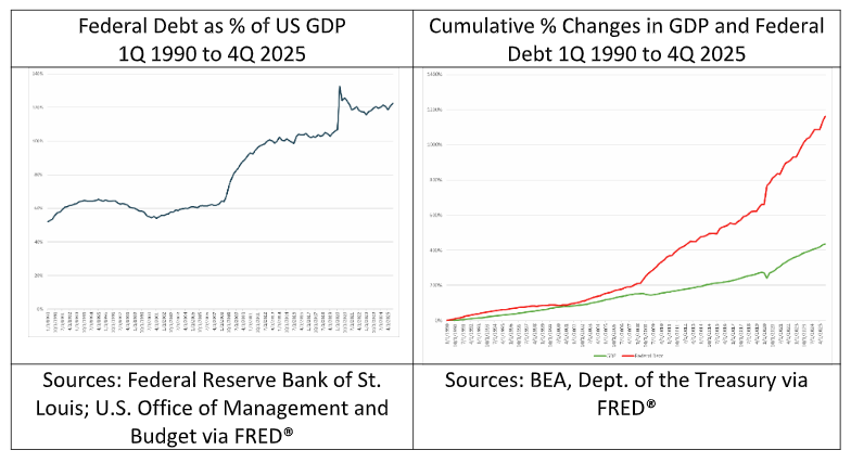 Outstanding Federal debt has grown from 52% of GDP to over 120%, since 1990.